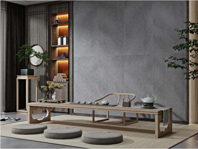 以【DCSS715RP05A秋夜雨】作為地麵裝飾,深灰與細絲白紋的搭配,宛如水墨畫般韻味十足,流露出儒雅而寧靜的空間氛圍感。
