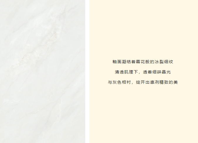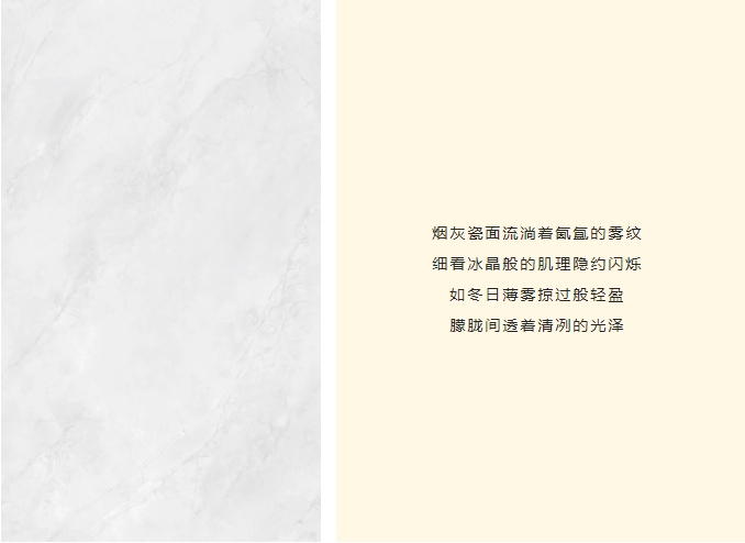 突破傳統瓷磚的二維表達,以三層納米釉料疊加工藝,構築立體光感矩陣,經1280度高溫淬煉,凝結98度水晶光感,讓釉麵在歲月侵蝕中始終葆有初生般的透潤光澤。