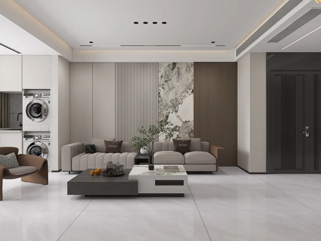 以希臘灰大麵積鋪貼空間,其設計感恰似天然水墨鋪展,光影交織間,延伸空間質感,演繹出優雅的生活格調。